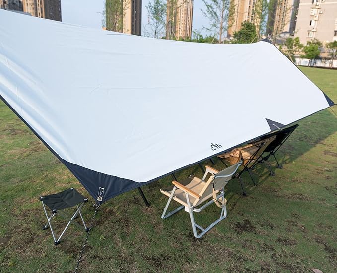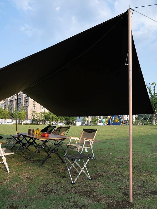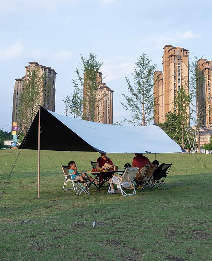 • Floor Area 14'4" × 9'6", fits for 4-8 person, this extremely stable shelter lets you set up a large protected communal area at camp. Durable ripstop 150D Oxford, this tarp can stand in strong winds; Color: Outside White, Inside Black