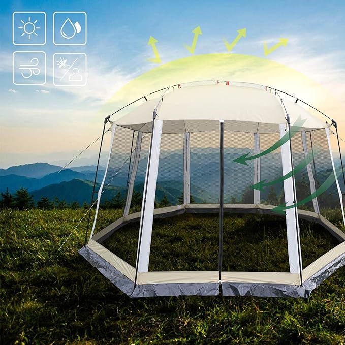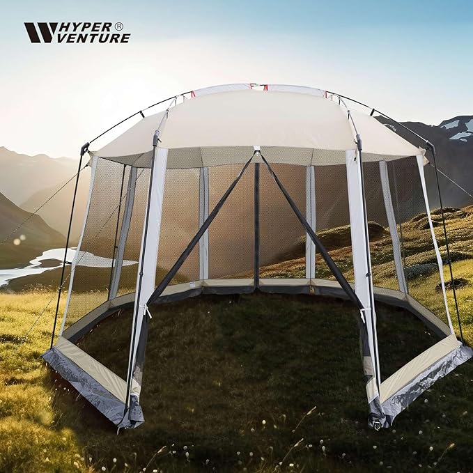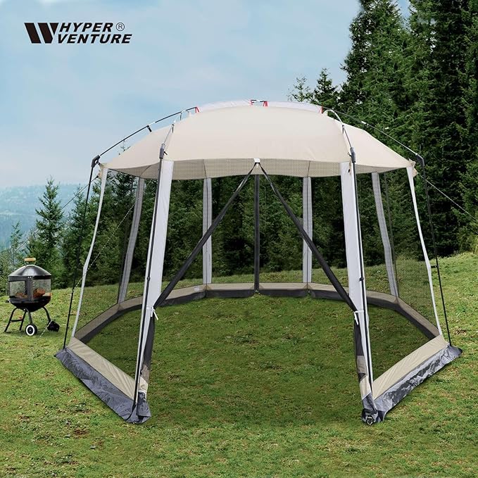 HYPER VENTURE Screen House 13x13 Feet Octagonal Mesh Canopy Camping Gazebo Shelter Tent for 8-10 People Outdoor Party Activities, Khaki