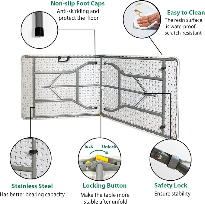• 【Advanced Materials】The high-quality HDPE table top can bear 330 lbs,it is 20% thicker than other cheap 6 foot folding tables. the table top is waterproof and stain-proof, you can easily wipe it clean, the locking button and the rust-proof powder-coated steel frame greatly improve the stability