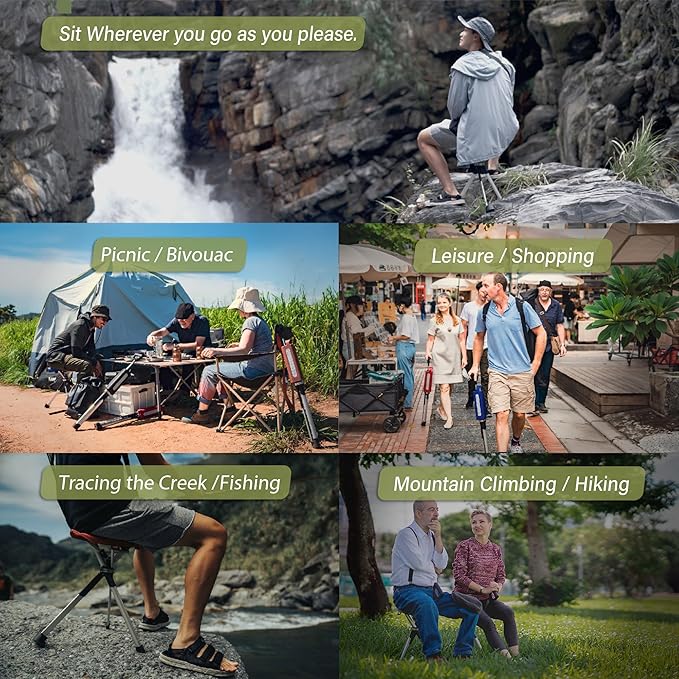 • ERGONOMIC HANDLE: As a hiking stick, the ergonomic handle with special tilt angles and grain texture makes it easy to hold, thereby reducing the user’s effort to carry. As a chair, with the largest seat among all similar products in the market, it brings in better sitting comfort and experience.
