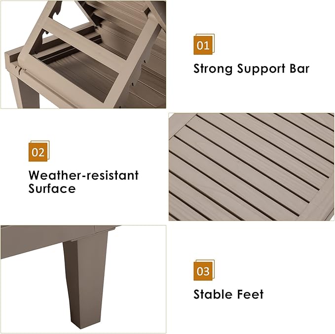 • High Quality Material & Solid Frame: Made of premium PP material, this outdoor chaise lounger is sun resistance and rain resistance, which is durable enough to stand the test of time. Strong construction with support bars behind the back can hold up to 400lbs. In addition, 6 reinforced legs offer extra support and stability.