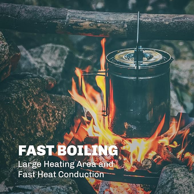 • OPEN FIRE SAFE: This compact cook kit is perfect for outdoor cooking for hot meals, coffee, or boiling water. The drip spout doule works as a steam hole for safe cooking. This is a must have camping and bushcraft survival gear for boiling, cooking and steaming, always using a gloove while handing the hot pot.