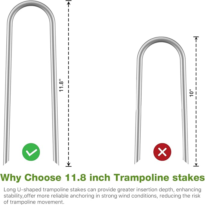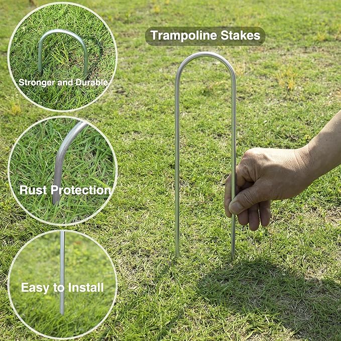 • 【Enhanced Stability and Safety with the Trampoline Anchor Kit】 The U-shaped trampoline stakes aim to provide additional stability, ensuring the safety of the trampoline during use. By securing the trampoline to the ground, these U stakes effectively prevent the trampoline from moving or tipping over during use, reducing the risk of accidents caused by this, and enhancing the stability and wind resistance of the trampoline.