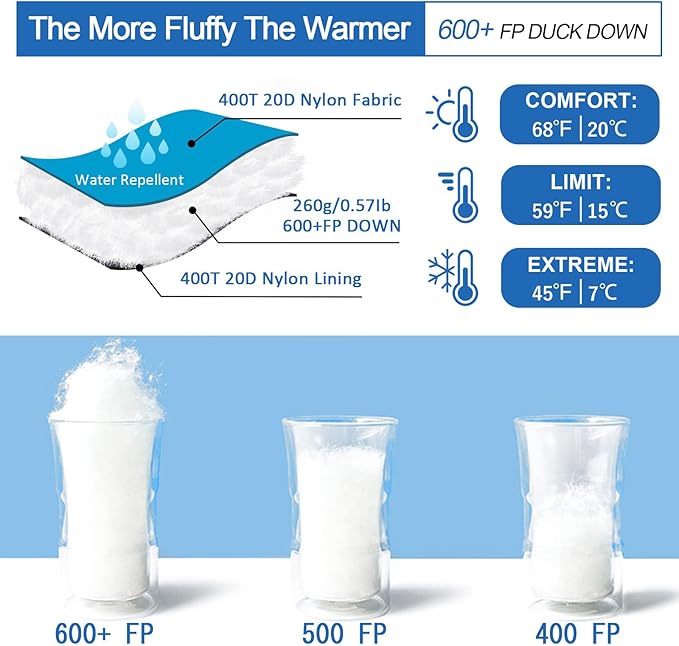 • 【 𝐊𝐄𝐄𝐏 𝐖𝐀𝐑𝐌 】The adult sleeping bag is filled with 260g selected duck down with 600 Fill Power, suitable for warm weather. Pure natural and healthy material, fluffy and soft, no odor or impurities. The sleeping bag specially adds a 1.6 " cloth strips for wind protection. Comfortable Temperature:59°F-68°F, Minimum Temperature: 45°F.