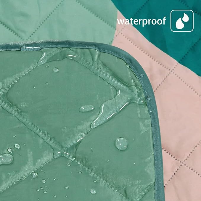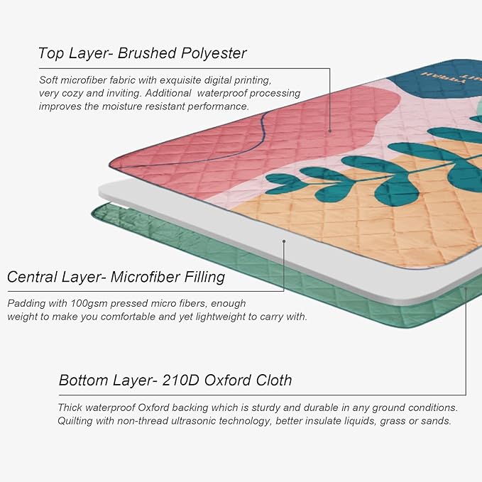 • Three Layers: Made of multi layers materials with ultra sonic quilting technology. Soft brushed fabric on the top, padding with pressed microfibers, and sturdy 210D oxford cloth as backing. Both the top and bottom are processed with waterproof finish,non thread sewing further improves the moisture performance, and better insulates grass or sands