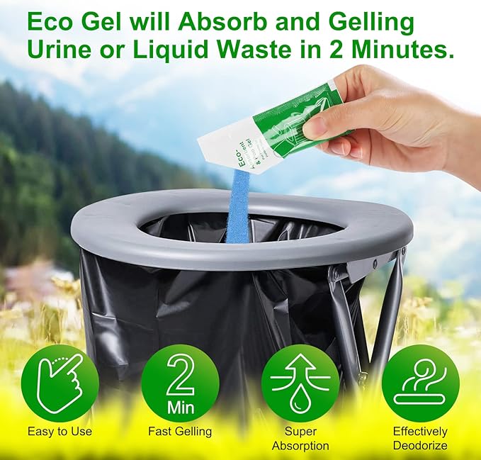 • Emergency Preparedness - You May need something like this for your emergency toilet. Perfect for no access to modern conveniences. d to your camping poop bag/camping shower bag to work with biodegradable waste bag and portable foldable toilet.Biodegradable Portable Toilet Absorbent Gel is also suitable for portable toilet for tailgating, RV toilet treatment, travel toilet, portable potty, camp toilet or portable toilet for home use. Avoid confusion , no need to waste water to clean the toilet