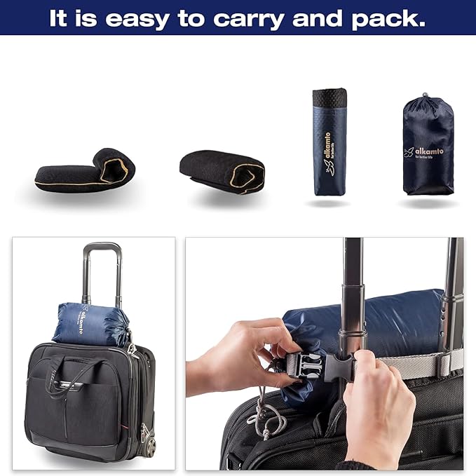 • ✔ COMFORT LIKE AT HOME - Our specially developed luxury viscoelastic memory foam pillow adapts perfectly to the contours of your head and neck, giving you all the soft comfort and support of your home pillow while on your travels, even while staying at hotels. The square, flat shape is versatile, which ensures maximizing comfort and rest no matter the position. No more uncomfortable inflated / blow up pillows, and no more stiff neck or shoulder pain when waking up!