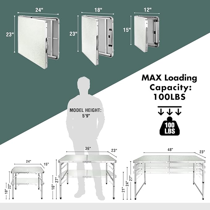 • Compact Folding Table with Adjustable Heights: 2 Adjustable heights for all occasions. Our 3ft folding table can be adjusted to a comfortable height of 16'' or 27''. The large surface area is 36''L x 23''W and can support up to 100 LBS, providing plenty of utilization space