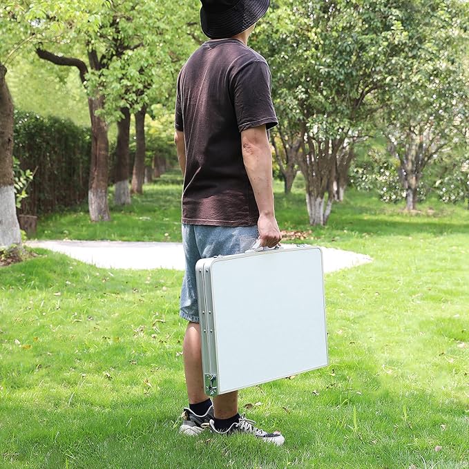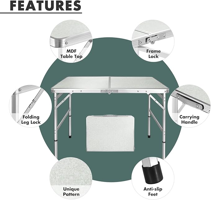 • Easy Set-Up & Take Down: Easily install the picnic aluminum table in seconds, no tools are required. Fold out the foldable table, insert the extended legs, lock the legs with lever locks, and lock the tabletop with side locks. Quick folding is also possible with the side lock when disassembling