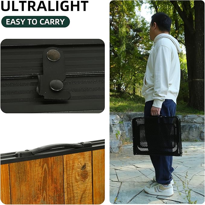 • NEW DESIGN: With the unique coated mesh and wood grain table design, this picnic table can effectively avoid water accumulation and rust. No tools needed! Open base frame, and you are ready to go! You can even assemble this using only one hand!