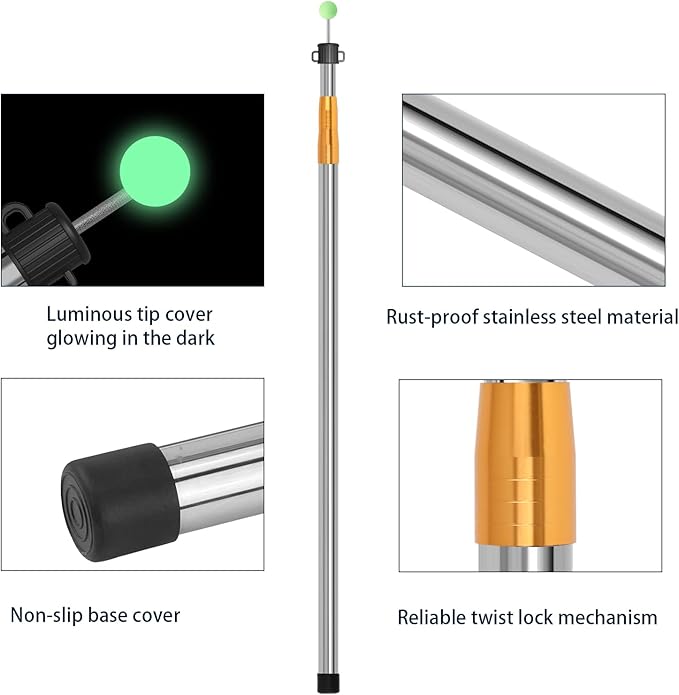 • 【Non-slip & Luminous】The metal tent tip with a removable newest luminous tip cover, glow in the dark, made of TPR insulation material, can prevent lightning strike. It can hold up the tent space when supporting the center of the tarp, effectively eliminating punctures while holding the tarp firmly in place to prevent collapse.