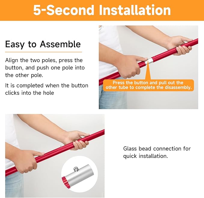• Simple Button Lock Mechanism Simplifies Your Installation Process: Just push the 2 sections of poles into the holes by buttressing,after use,simply pull the spring to disassemble.