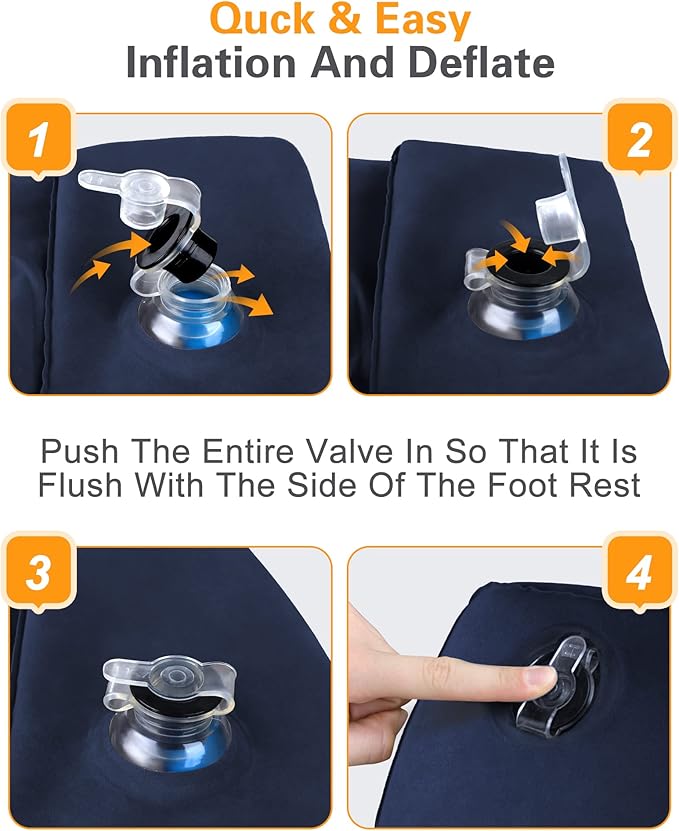 • Very User-Friendly Design: Our inflatable foot rest pillow with 2-in-1 double valve,the upper black air valve is a one-way air inlet for inflating or replenishing gas.bottom transparent air valve can be quickly inflated and deflated,when you are done blowing it up, push clear cover on and push whole valve in so that it is flush with the side of the travel foot pillow,the airplane footrest takes away the hassle of bringing a pump and making noise in flight.