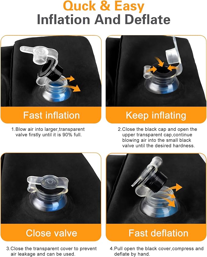 • Very User-Friendly Design: Our inflatable foot rest pillow with 2-in-1 double valve,the upper black air valve is a one-way air inlet for inflating or replenishing gas.bottom transparent air valve can be quickly inflated and deflated,when you are done blowing it up, push clear cover on and push whole valve in so that it is flush with the side of the travel foot pillow,the airplane footrest takes away the hassle of bringing a pump and making noise in flight.