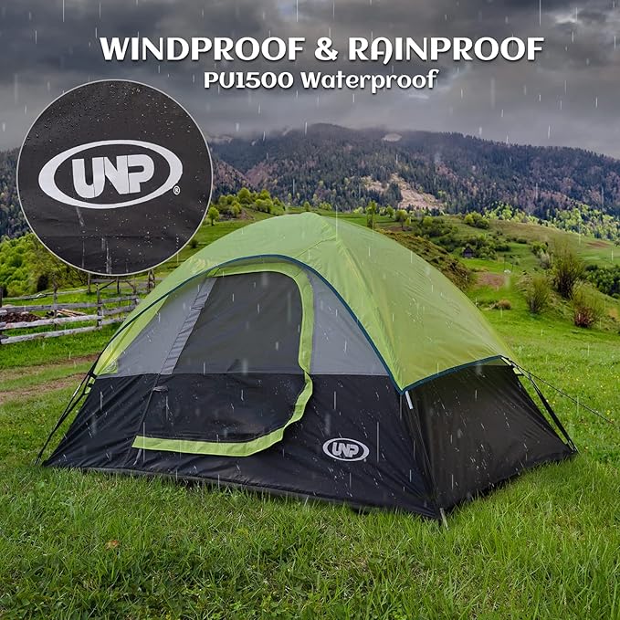 • 【Windproof & Rainproof 】:The camping tent is made of stronger tear-resistant polyester.It come with a removable rainfly and two zippers designed for keeping the rain outside the tent. The ropes of tent and piles ensure safety and stability.