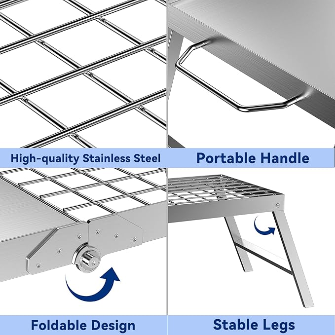 Skyflame Folding Campfire Grill, Portable Stainless Steel Camping Grill Grate and Camp Grill Griddle with Collapsible Legs for Versatile Outdoor Backpacking BBQ Over Fire Pit Cooking