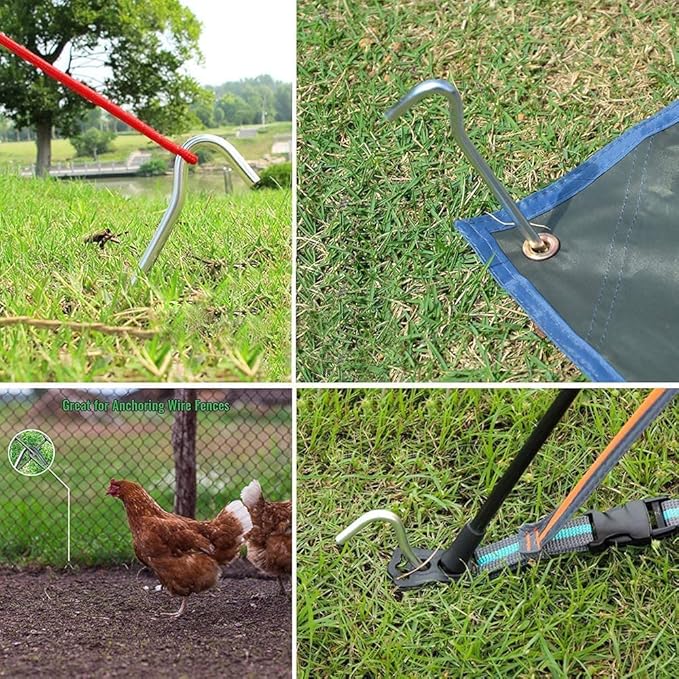 • Size: Galvanized Steel Spikes are 9" length with 1" hook for attaching rope or for anchoring, perfect tent pegs, tarp hooks,tent hooks,tent spikes