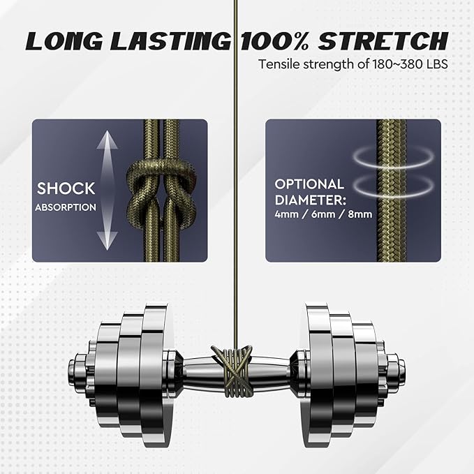 • DEPENDABLE PERFORMANCE – DASKIGO's bungee shock cord has a guaranteed 100% stretch (+/- 10%),100% stretch, a tensile strength of ~380 LBS, as well a high-modulus which helps to eliminate deformation or a loss of stretch over time. Additionally, we maximize abrasion resistance and longevity by utilizing top specification Nylon for the sheath material.