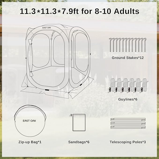• ๐—ฃ๐—ผ๐—ฝ-๐˜‚๐—ฝ ๏ผ† ๐—˜๐—ฎ๐˜€๐˜† ๐˜๐—ผ ๐—ฆ๐—ฒ๐˜ ๐˜‚๐—ฝ ๐—ผ๐—ฟ ๐—ฆ๐˜๐—ผ๐—ฟ๐—ฎ๐—ด๐—ฒ : Suitable for 8-10 people, EAST OAK portable screen house features a convenient pop-up design that allows for easy installation by a single person in about one minute. Designed to be easily folded, the tent comes with a convenient carrying bag. Its dimensions are 33.5*3.9*33.5 inches, making it easy to store.