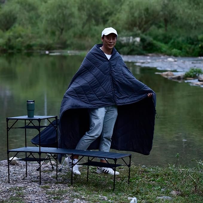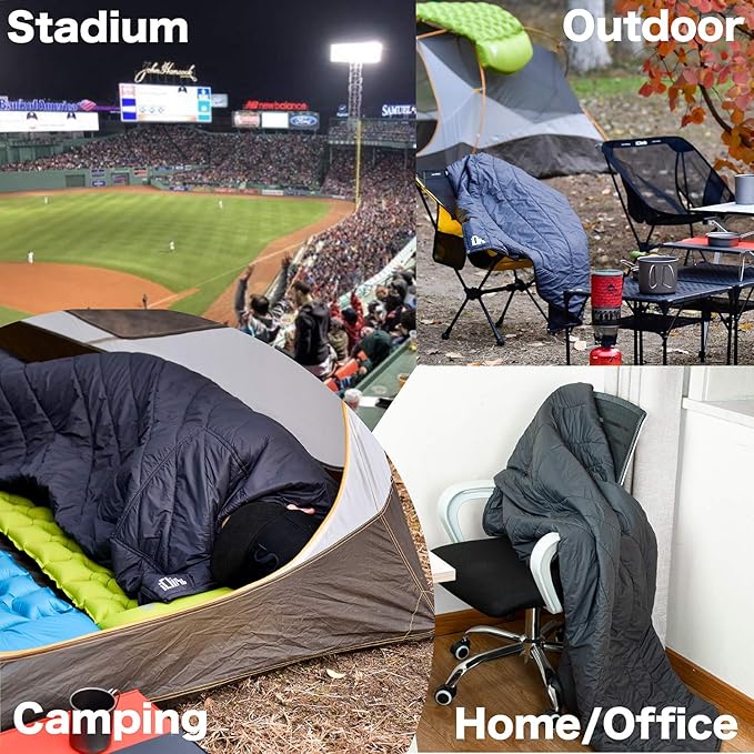 • Multifunctional. With the buttons and elastic straps, this blanket can be used as quilt, poncho, shawl, temporary sleeping bag. You can also put two blankets together and make it one two-person sleeping bag. Keeping you cozy while sitting around the fire or on your couch, lying in hammocks, reading books, tailgating, cooking meals. Perfect for camping, backpacking, hiking, mountaineering, traveling, lounging, picnics, beach trips, concert events, airplane trips, and other outdoor activities.