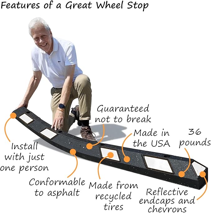 • DURABLE. Resistant to extreme temperature variations, UV light, oils, moisture, road salt and damage. Rubber Wheel Stops will not rust, chip, crack, crumble, corrode or need repainting.