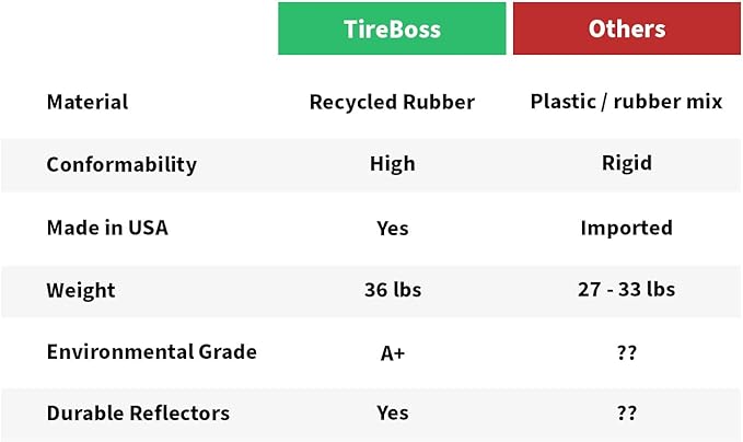 • RECYCLED. Wheel Stops are made from 100% recycled rubber car and truck tires. A mix of natural rubber and styrene-butadiene rubber is compression molded to form a durable, long-lasting alternative to traditional concrete or plastic stops. Our TireBoss parking stops are some of the “greenest” on the market. Each of our parking stops take 2-3 tires out of landfills in the USA and Canada. Unlike most others, we don’t use virgin rubber from China (which is an environmental calamity)!