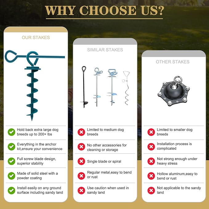 • GIVE IT AS A GIFT! Every package includes: gravity dog tie out stake + Easy-lever Installation tool + cleaning brush + leash clip + portable carrying bag. With this dog anchor, you give the gift of safety and peace of mind to pet owners.
