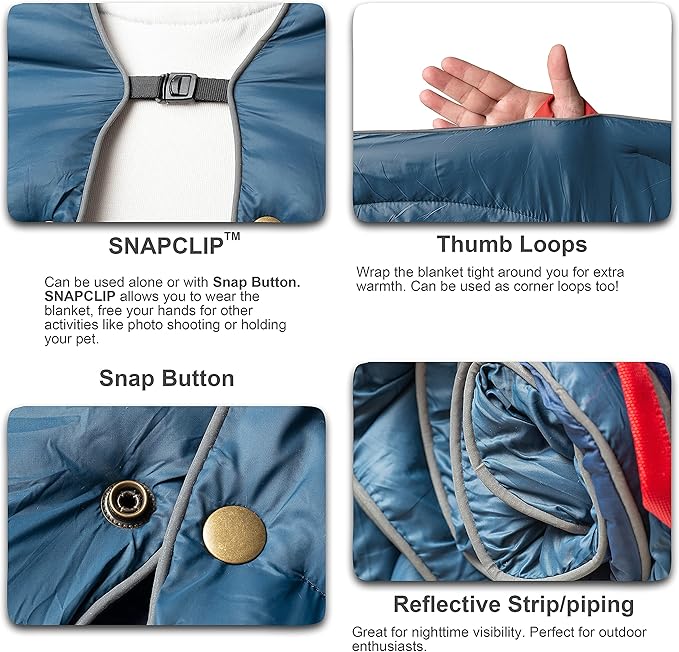 • 🎯 WEARABLE LIKE PONCHO LINER 🎯 The distinguished SNAPCLIP allows you to wear the blanket, free your hands for other activities like photo shooting, preparing food, holding your pet while staying warm. The Snap Button is a surplus and more convenient.