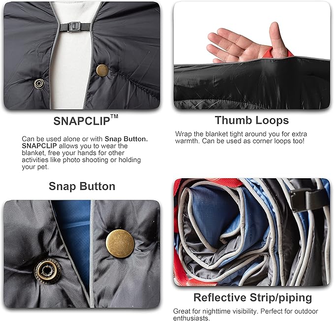 • 🎯 WEARABLE LIKE PONCHO LINER 🎯 The distinguished SNAPCLIP allows you to wear the blanket, free your hands for other activities like photo shooting, preparing food, holding your pet while staying warm. The Snap Button is a surplus and more convenient.