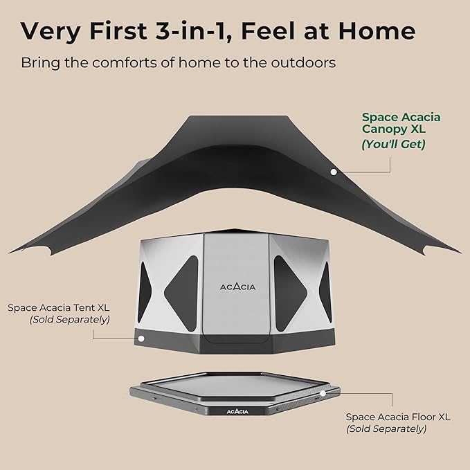 • 3-IN-1 NEW CAMPING SYSTEM: The Space Acacia consists of a spacious, modern glamping tent, the first-of-its-kind proprietary air floor and the innovative, temperature-adjusting canopy. All 3 thoughtfully designed components work in harmony to enable you to live an indoor lifestyle, outdoors.
