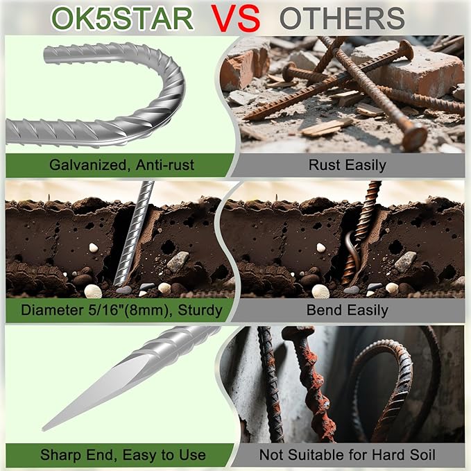 • EASY TO USE: Chisel point end makes the galvanized rebar stakes easy insert into the ground and save effort. J hook rebar stakes are easy to hammer down. Mainly for soft soil, the bending rate of hard soil/gravel ground is reduced by 60%