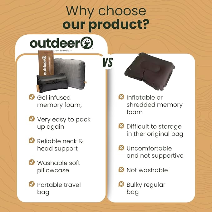 • 🏕️ [CARRY ANYWHERE] - Very easy to fold and pack our memory foam pillow into the included waterproof travel bag and keep it securely compressed so you cand take it anywhere. You will love our OUTDEER original travel bag design.