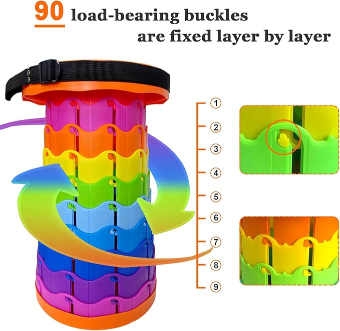 • Thoughtful Design: There are two buckles on the top and bottom of the portable telescoping stool. You can hold the two buckles to stretch and turn them clockwise/counterclockwise, making it easy to open and close. The travel stool camping stool is a great gift for friends who love outdoor.
