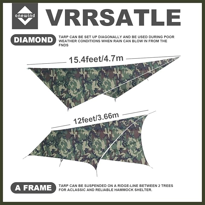 • ULTIMATE HYBRID TARP. Whether you need a home for your backcountry campsite or a place to stash your camping gears from prying eyes, a camouflage tarp is a lifesaver. Our Onewind Camouflage Tarp features a woodland camo design that is the perfect tarping solution in the bush or in the wild. It helps you build different kinds of emergency shelters that blends well into the surrounding landscape.
