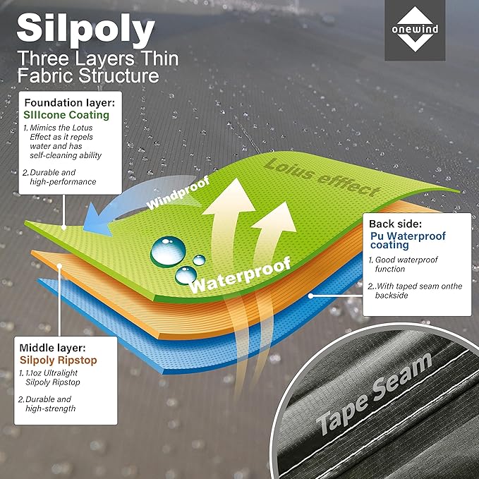 • SUPERIOR PROTECTION AND WATERPROOF. Measuring 12 x 10ft our Hammock Tarp offers wide coverage and delivers excellent shielding from the elements - rain, sun, and wind. It's made from 1.1oz 20D ultralight ripstop silnylon which is strong, durable, waterproof, windproof snowproof, and much lighter than 210T fabric. It also features PU 4000mm coating on inner face and silicone coating on outer face to make the rain slide down faster.