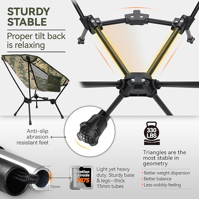 • Superior Comfort: Proper tilt angle allows you to lounge comfortably in this chair while maintain a normal sitting posture to chat with friends. Triangular base distributes weight evenly, keeping gravity balanced without wobbling. Ripstop polyester seat and robust aircraft-grade aluminum frame ensure long-term use.