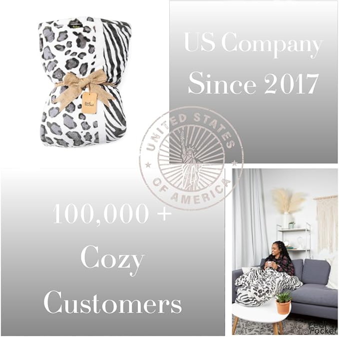 • FABULOUSLY FIERCE FOOT POCKET BLANKET: This cozy blanket features a mixture of light greys, dark greys, and cream, patterned in a leopard and zebra style. Thanks to the patented foot pocket design, you can cover both your feet and shoulders for all-around comfort. It’s machine washable and dryer friendly.