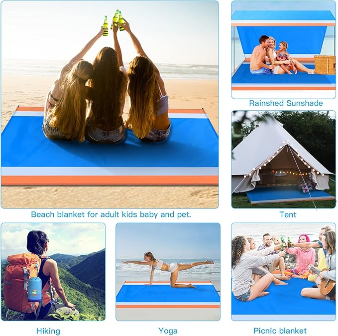 • 🏕️Beach Blanket Oversized:Good tear resistance,dry quickly. Can also be used as a rain shed,sunshade,tent,toddler crawl,emergency mat. Feel comfortable to lying down. Won't irritate your skin,better professional fabric sewing.