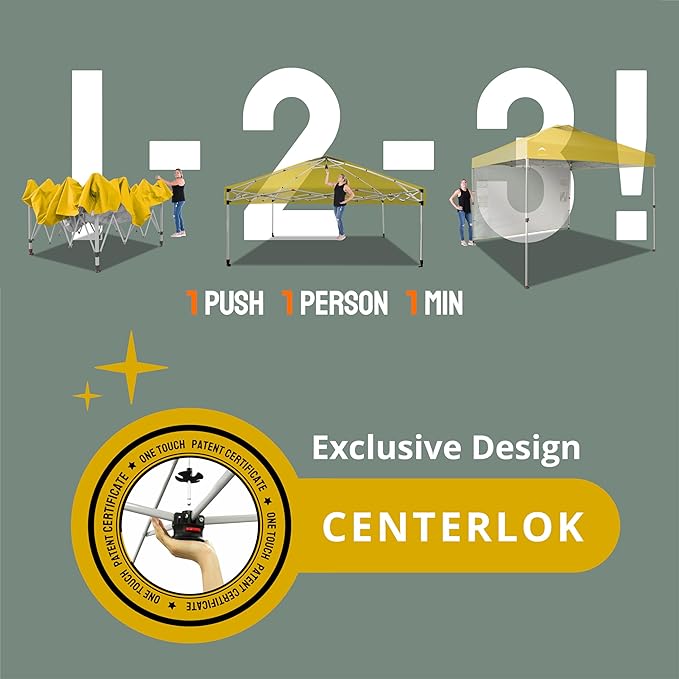 • ONE BUTTON EASY SET UP - Our 10x10 pop up canopy tent features patented one push center lock tech. With just a single push, the central hub locks the poles in place. Designed for the next generation, this outdoor canopy for patio can be set up by two people in seconds without any tools. Three adjustable height settings with soft, pinch-free buttons ensure convenience and safety, making it perfect for camping, beach outings, craft fairs, tailgating, farmer markets, outdoor BBQs, and more