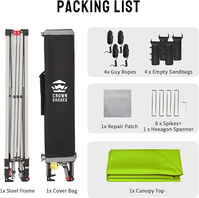 • STO’ N GO SYSTEM - Our lift-free system makes collapsing, storing, and transporting the 10x10 tent a breeze. The 10x10 popup canopy can be stored with the fabric attached, with a specialized pocket for 4 sandbags, 8 stakes, and 4 guy ropes. Integrated wheels in the feet allow easy movement even when the instant shelter tent is set up, by simply lifting the side without wheels. This feature is especially useful for quick setup and takedown at locations like the patio or sports events