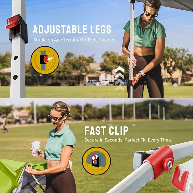 • FAST CLIP CANOPY FABRIC - The new clip system easily attaches the canopy fabric to the frame. The silver-coated interior provides UPF 50+ UV protection, ensuring cooler and safer shade. Made from rugged 150D fabric, the pop up tent is water-resistant and flame-resistant (CPAI-84). Integrated air vents and the Fast Clip system prevent wind lift and rain pooling, reducing fabric tearing risks. This innovative design is ideal for outdoor events and gatherings