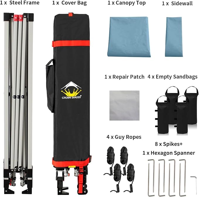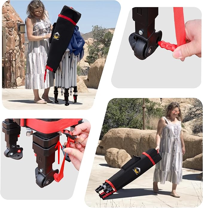 • STO’ N GO SYSTEM - Our lift-free system makes collapsing, storing, and transporting the 10x10 tent a breeze. The 10x10 tents can be stored with the fabric attached, with a specialized pocket for 4 sandbags, 8 stakes, and 4 guy ropes. Integrated wheels in the feet allow easy movement even when the instant shelter tent is set up, by simply lifting the side without wheels. This feature is especially useful for quick setup and takedown at locations like the patio or sports events
