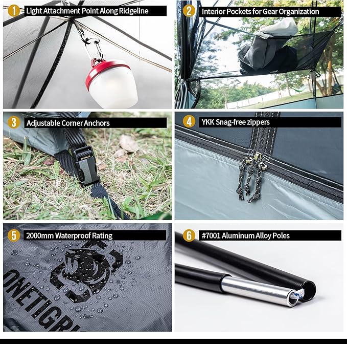 • Waterproof/Durable Material: 20D Plaid Ripstop polyester construction with 75D nylon tent bottom offering rugged durability, with 2000mm waterproof coating. OneTigris Waterproof Backpacking Tent is perfect for overnight sleeping for backpacking, camping, hunting, and other adventuring activities.