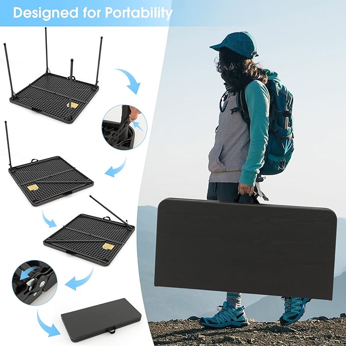 • Multi-functional Indoor and Outdoor Use - The large tabletop features room up to 4 people so that this plastic folding table will be a great choice for different activities, such as parties, family reunions, playing cards, puzzles, crafts, mah jongg. Also suitable for patio, lawn, picnic, trade shows, meetings, receptions, and banquet venues.