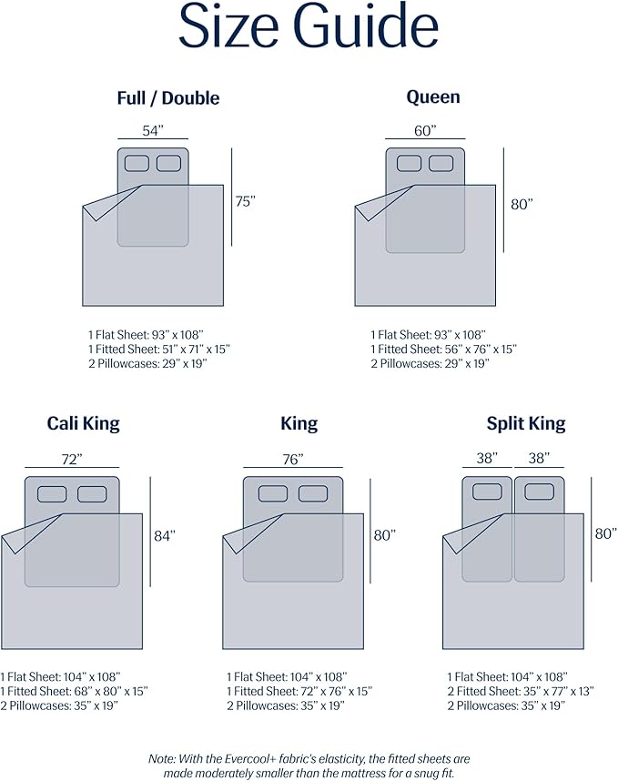 • Includes 1 Cali King size (68x80x15 inches) Cooling Fitted Sheet and One Cali King size Flat Sheet (104X108 inches); Ultra breathable Evercool+ sheet set to elevate any bed; Deep pocket fitted sheet for mattresses up to 18 inches thick with helpful 'long side' and 'short side' tabs for easy install; Extra wide elastic band around edge ensure a secure fit that stays all night