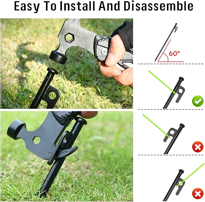 • 【Easy to use】With a large flat head and sharp point, it's easy to drive the stake into the hard ground with a hammer. TIPS: Set the tent peg and ground at a 60-degree angle, leaving about 1.6 inches (4 cm) free to allow enough room to tension the rope.