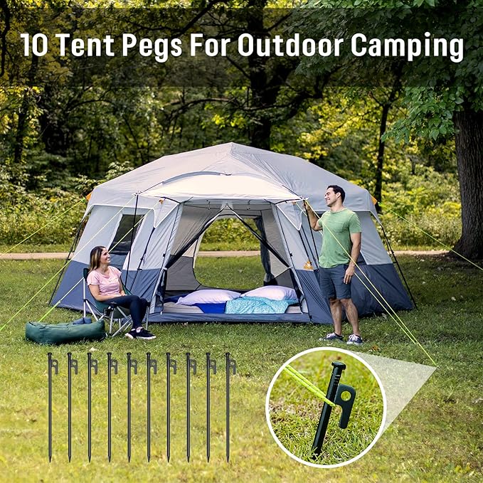• 【Heavy duty tent pegs】Heavy-duty set of 10 tent pegs - 11.81" in length, 9mm in diameter. Made of high quality steel with black finish, these tent pegs are durable to use and enough to stand up to the wind.