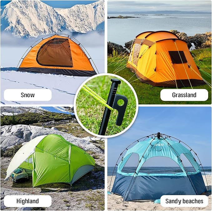 • 【Wide recognition】heavy-duty tent pegs hold up in dirt, sand, grass and rocky ground in high winds. An indispensable tool for securing tents, tarps, canopies, picnic mats, sun shades, etc.