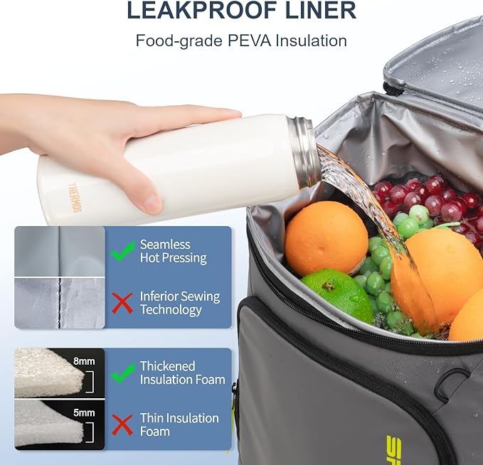 • Leak-proof Liner: Our cooler backpack liner adopts high-tech seamless hot pressing process for leak-proof; The zipper is not leakproof, please be careful not to tip over when using it.