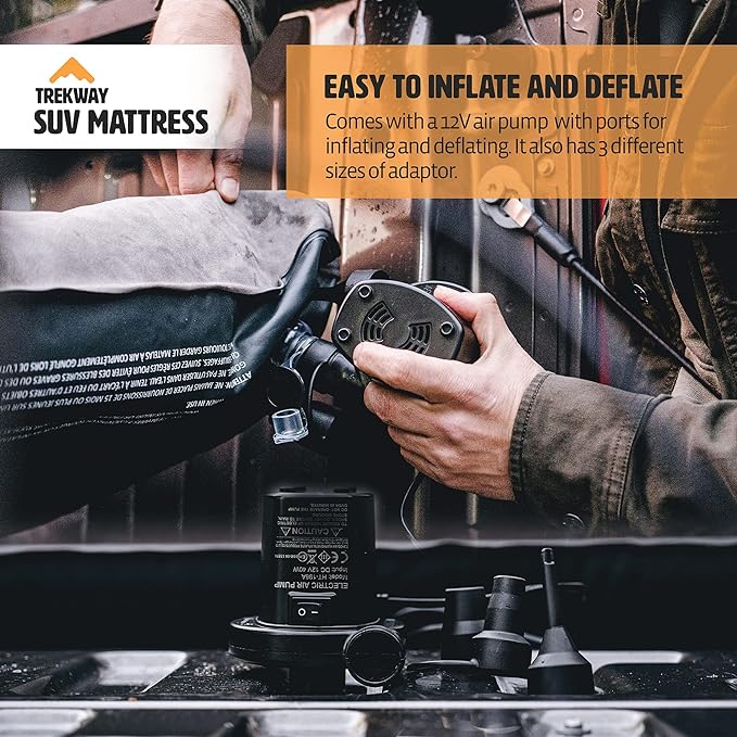 • INFLATES AND DEFLATES EASILY - Includes an electric 12V air pump to allow for quick and easy inflation in minutes. Deflates and stows just as easily. Simply fold down your backseats and inflate.